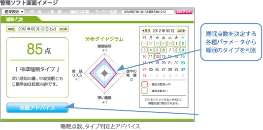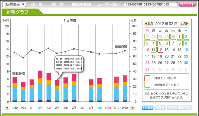 寝つきの時間や睡眠途中の覚醒、深い睡眠、体動、深い睡眠に入るまでの時間等の情報を睡眠中の呼吸、脈拍、体動による振動をもとに睡眠点数で表します。