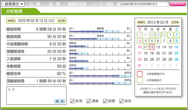 - 充実した専用データ管理ソフトで、睡眠管理に役立つ情報を提供